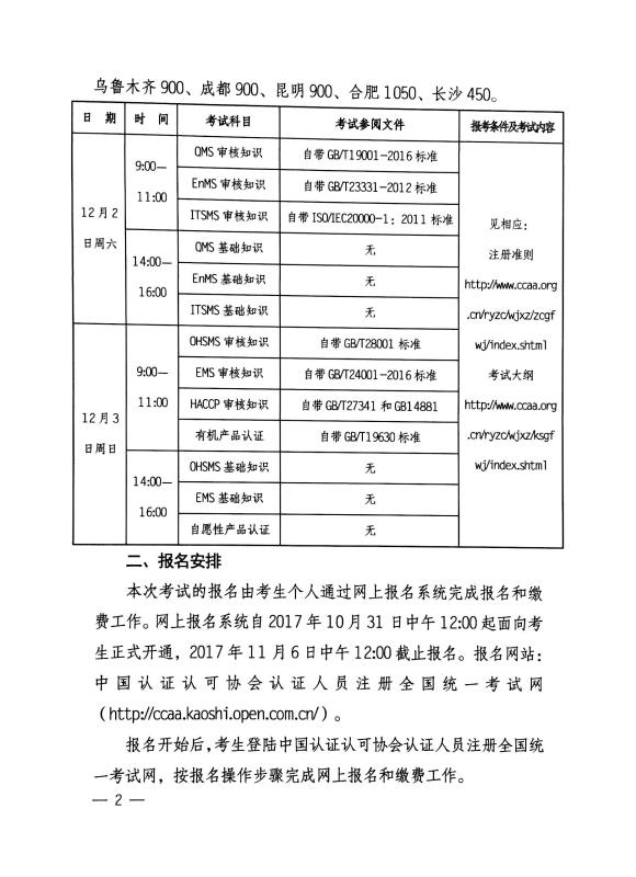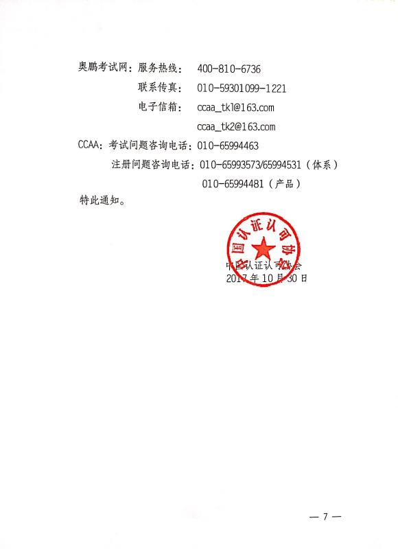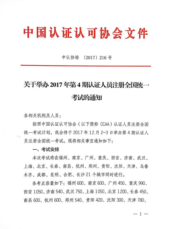 中国认证认可协会于2017年10月30日发布《关于举办2017年第4期认证人员注册全国统一考试的通知》,以下为文件详细内容: